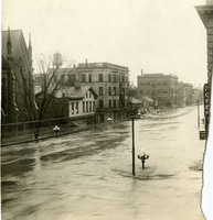 Flood waters on Ludlow StreetView of flood waters on Ludlow Street in downtown Dayton. The Grace Methodist Episcopal Church (corner of Fourth Street and Ludlow) is visible on the far left, and Jenkins Drug Store (corner of Fifth Street and Ludlow) is visible in the center of the torn photograph. Two people awaiting rescue can be seen in the windows of the second building from the left.