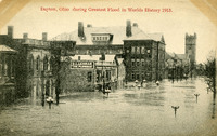 Flooding on West Fourth StreetPostcard showing flood waters on West Fourth Street in Dayton. The large building in the center of the photograph is Central School, and the First United Brethren Church can be seen on the far right. Transcript of back states 'Kraemer Art Cincinnati Postcard' Dayton, Ohio during Greatest Flood in Worlds History 1913.