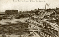 Flood ravaged lumberyard at Monument and Taylor StreetsPostcard depicting the wreckage caused by the flood at a lumberyard located at the corner of Monument Street and Taylor Street in Dayton. On back of postcard is statement 'Pub. By The Acmegraph Co., Chicago' Lumber Scene at Monument & Taylor Sts., Dayton, O.