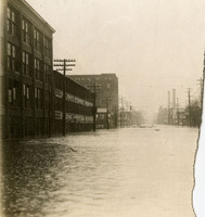Flood waters on East Third StreetTorn photograph with a view of flood waters on East Third Street in Downtown Dayton, outside of the Dayton Paper Novelty Company.