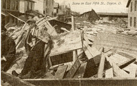 Flood wreckage on East Fifth StreetPostcard showing two men reclined on a pile of wreckage on East Fifth Street following the flood. Transcript of back reads 'Published by The Acmegraph Co., Chicago, Ill.' Scene on East Fifth St., Dayton, O.