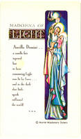 Madonna of Light holy cardThe Madonna of Light holy card includes an image of the Blessed Virgin Mary holding infant Jesus on her shoulder as he lights a candle. The card was published by the Marist Missionary Sisters circa 1955. Front includes a poem by Sr. M. M.