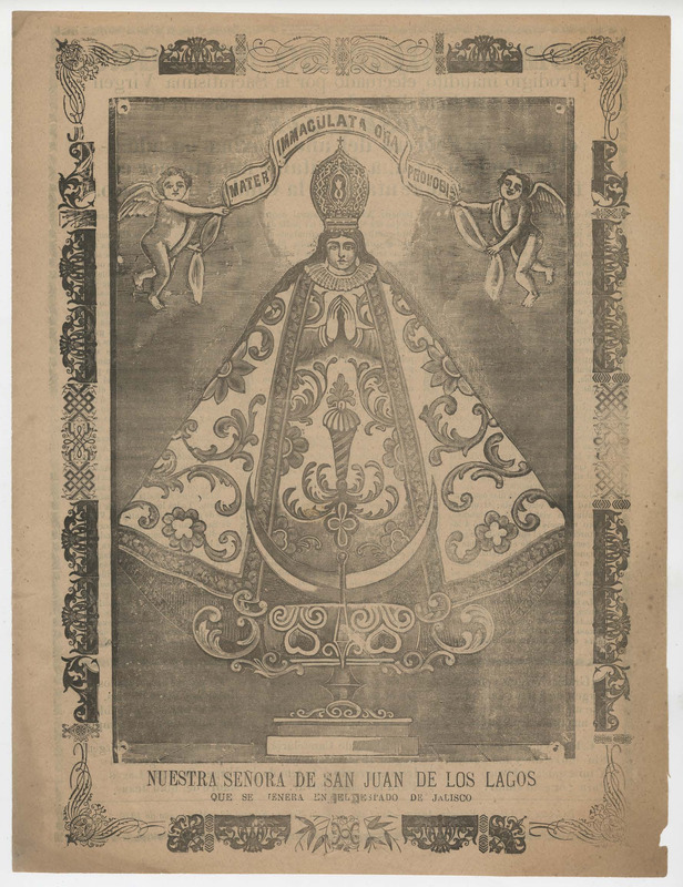 The recto is a full-page engraving of Our Lady of San Juan de los Lagos with a highly decorative border. Two angels flank the image, carrying a banner that reads 'Mater Immaculata Ora Pro Nobis' (or 'Immaculate Mother, pray for us'). The text on the verso describes a miracle allegedly performed by Our Lady of San Juan de los Lagos. Jose F. Luna, a coal merchant, fell ill from typhus. Treatments failed and his condition worsened until it seemed certain he would die. Jose's wife Amalia prayed fervently with her children to Our Lady of San Juan de los Lagos. In turn, Jose made a slow but complete recovery and eventually the family visited the image of the Virgin to give thanks. The text closes with a prayer of thanksgiving.