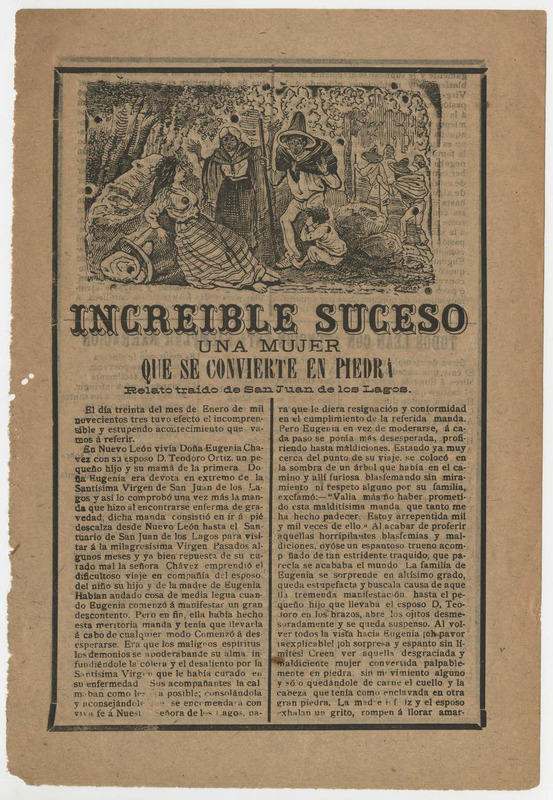Engraving at the top of the recto shows a group of four figures in the foreground. In the center a man and women are standing and have arms raised and facial expressions that show surprise. The man is wearing a hat and carries a walking stick; both figures are wearing cloaks. A child sits at the foot of the man and with his hands covering his face. To the left of these figures, a shoeless woman with her hair in disarray lays against a small boulder. The background of the scene shows a forested setting, and to the right a group of people with hats and walking sticks are shown walking from behind. The text of the broadside tells the story of Dona Eugenia Chavez, who recovers from a serious illness and in turn undertakes a pilgrimage between Nuevo Leon and the Basilica of Our Lady of San Juan de los Lagos barefoot. Accompanied by her husband, mother, and child, during the journey Eugenia is possessed by demons and begins to curse the difficult journey and express anger toward Our Lady of San Juan de los Lagos. Near the end of the journey, Eugenia takes shelter under a tree and expresses that she wishes she had never undertaken the pilgrimage. There is a large thunderclap and Eugenia is turned to stone, much to her family's terror. Eugenia's mother and husband beg her to repent and ask to the Virgin to have compassion. Eugenia refuses to repent and the family begs for mercy at the sanctuary of Our Lady of San Juan de los Lagos. Given the severity of Eugenia's actions, she remains in her stone form, much like Lot's wife, who was turned into a pillar of salt when she looked back at Sodom. The story concludes by noting that faith and contrition are the what is required by God and Mary; instructing readers that Eugenia could have quit her pilgrimage without cursing or blaspheming and all would have been settled. The bottom of the verso contains a retelling of Eugenia's story in verse.