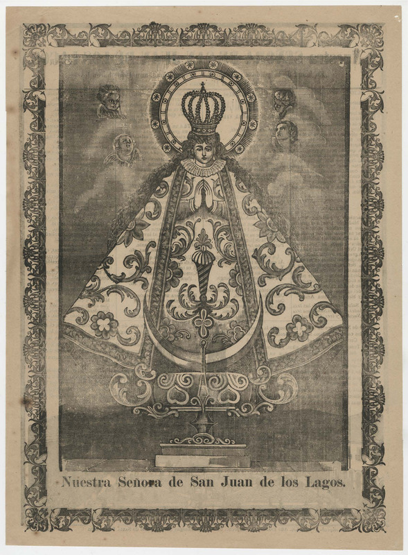 The recto is a full-page engraving of Our Lady of San Juan de los Lagos with a highly decorative border, and the bottom half of the verso is an engraving of the Basilica of Our Lady of San Juan de los Lagos and its plaza. The text on the verso is comprised mostly of prayers from the point of view of a pilgrim to the Basilica of Our Lady of San Juan de los Lagos. It includes an act of contrition and praises for various miracles performed by the Virgin. It concludes with a short history of the basilica and its annual festival. Possibly a souvenir from the Basilica of Our Lady of San Juan de los Lagos.