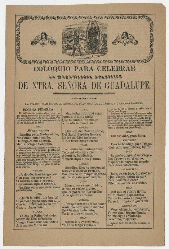 An engraving on the top of the recto shows Juan Diego, with back turned, facing the apparition of Our Lady of Guadalupe with a hill in the background. Angels flank the scene, and all are encased in an elaborate border. The text is a short dramatization with dialogue, scenic directions, and a musical chorus. It details a conversation between Juan Diego and Our Lady of Guadalupe. It begins with the first apparition at Tepeyac Hill, with the Virgin instructing Juan Diego to go to the Archbishop of Mexico City, Juan de Zumarraga, to tell him to build a temple on the hill for her. The dialogue shifts to this conversation between Diego and Zumarraga, in which the archbishop does not believe the story and sends Diego away. In this dramatization, Juan Diego plans to go home but is taken by the arms back to the apparition. He explains the archbishop's disbelief, and she shows him the Castilian roses miraculously growing on Tepeyac Hill. In another conversation with the archbishop, Juan Diego presents the roses and tilma to validate the apparition.