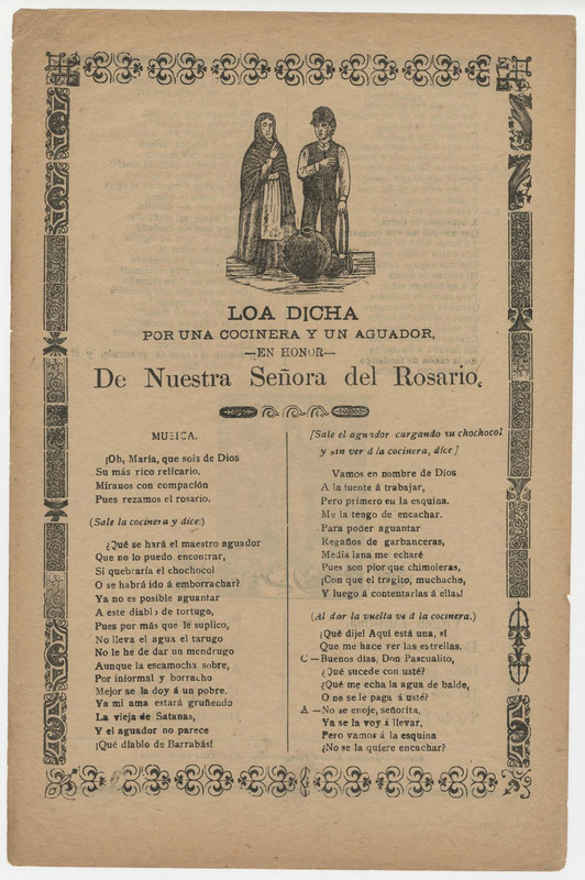 The recto contains an engraving of two figures, a woman on the left and a man on the right. The woman holds out her finger toward him. A large pot stands between them. The text is a loa, a short dramatic work that originated in Spain but that proliferated in Latin America. Loas entertained audiences waiting for the beginning of a festival or full length theatrical work. The dialogue of this work in between a cook and a water carrier. When a religious procession passes them, they stop their conversation and join in prayer for Our Lady of the Rosary.
