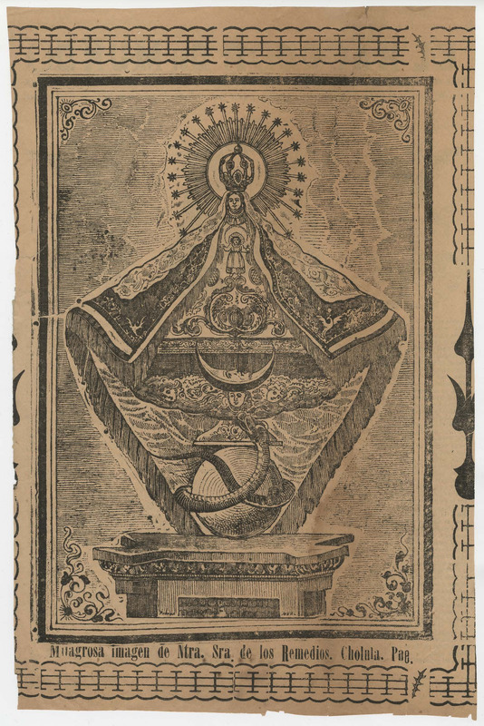The recto has a full-page engraving of Our Lady of Los Remedios, with a large crown and mantle. The mantle drapes over the moon and heavens at her feet, resting on a snake wrapped around a sphere. The figure is atop a pedestal. The verso has an engraving depicting Jesus with a crown of thorns and tears of blood, flanked by angels. The text describes an elderly woman who must beg for food; she visits her son who is a rich man and asks for his help. He refuses cruelly, claiming that he owes nothing to her and sends her to work in his fields. His wife, a Catholic, warns him that they must honor their parents, and she offers to serve her mother-in-law. They mount horses to find her in the fields, but a massive flood strikes and washes away the man's farms, taking his wealth with it. The author entreats the reader to wear a scapular.